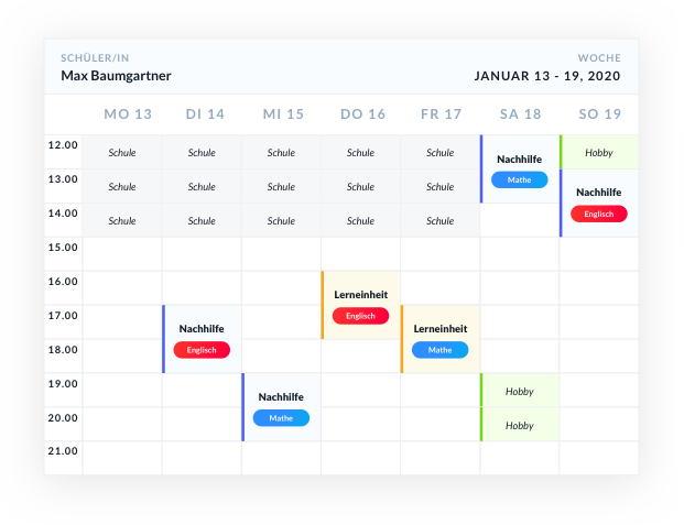 Nachhilfe-Einheiten können jederzeit in Absprache mit dem Lehrer gebucht werden.
